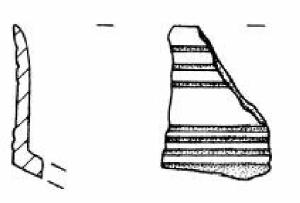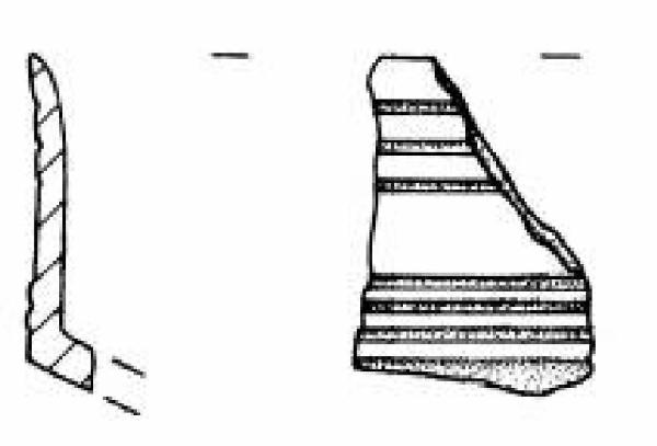 Orlo arrotondato, assottigliato, leggermente esoverso. Parete superiore a profilo leggermente concavo decorata con due fasci di tre sottili solcature orizzontali. Carena a spigolo vivo e vasca troncoconica.