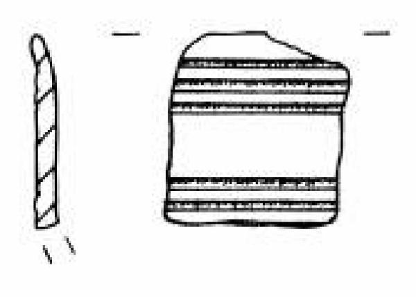 Orlo arrotondato, assottigliato, leggermente esoverso. Parete superiore rettilinea decorata con due fasci di tre sottili solcature orizzontali.