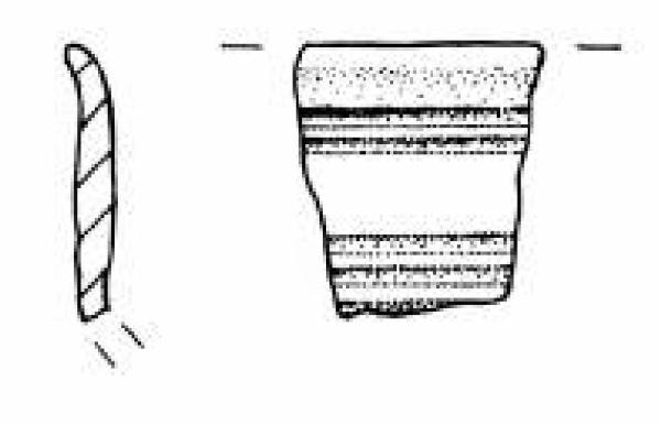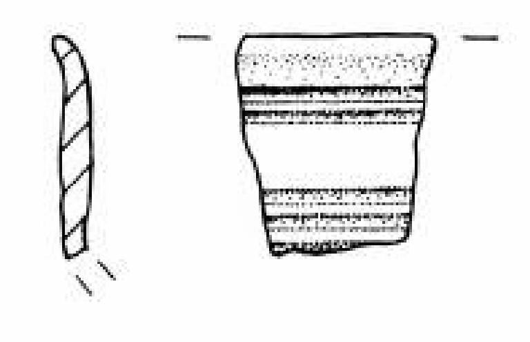 Orlo arrotondato, assottigliato, esoverso. Parete superiore rettilinea decorata con un fascio di due e uno di tre sottili solcature orizzontali.