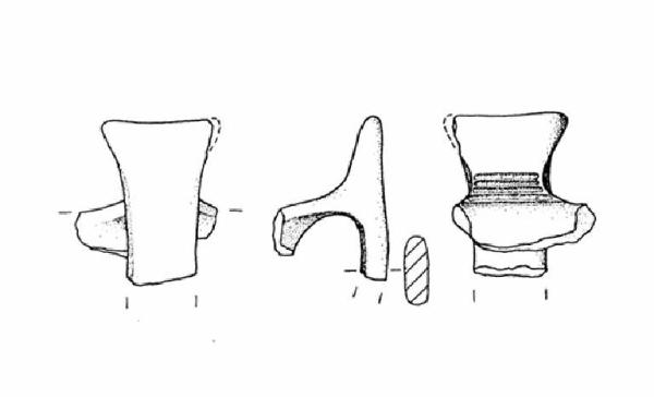 Ansa ad ascia con taglio rettilineao ed espanso, decorata sulla superficie interna dell'attacco superiore con un fascio di cinque solcature orizzontali di lunghezza decrescente verso l'alto, l'estremità superiore destra è frammentaria.