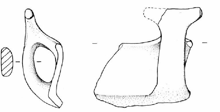 Due frammenti con orlo arrotondato esoverso, parete superiore a profilo leggermente concavo. Ansa a "T" con taglio leggermente insellato e appendice sinistra mancante.