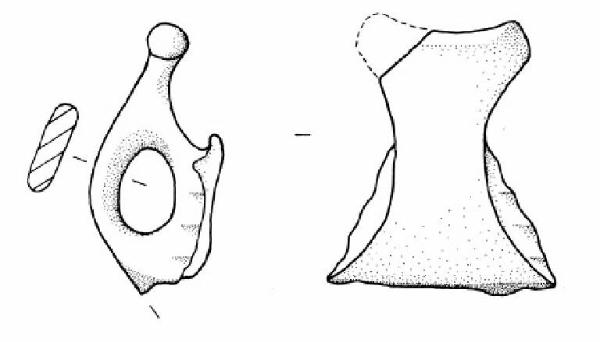 Orlo arrotondato esoverso. Parete superiore a profilo concavo decorata con una fascio di tre larghe solcature. Ansa a corna tronche con taglio insellato con appendice sinistra mancante.