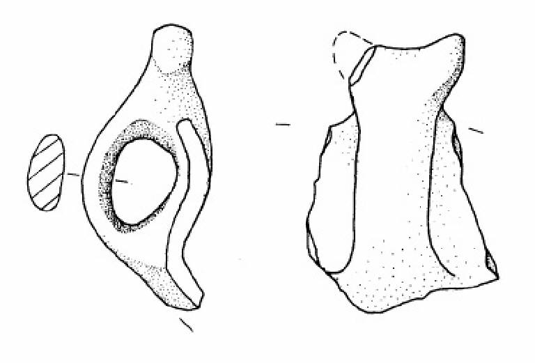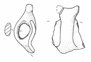 Orlo arrotondato. Parete superiore a profilo concavo. Ansa a corna tronche leggermente sviluppate verticalmente con taglio leggermente insellato con appendice sinistra mancante.