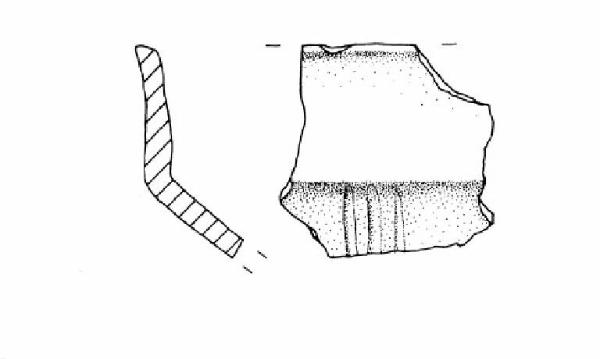 Orlo piatto esoverso. Parete superiore rettilinea. Carena arrotondata e vasca troncoconica decorata conun fascio di tre solcature verticali che partono dalla carena.