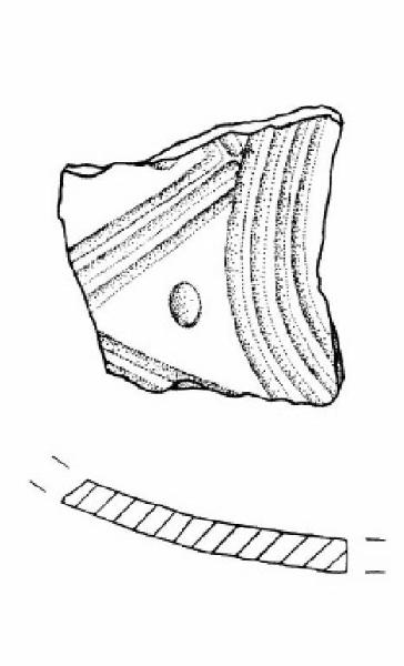 Vasca a calotta decorata con un fascio circolare di quattro solcature disposto intorno al fondo su cui poggia una teoria di triangoli formati da fasci di tre solcature con al centro una coppella. Si conserva una piccola porzione di fondo.