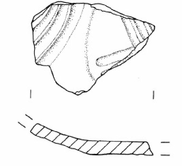 Vasca a calotta decorata con un fascio di solcature disposto a semicerchio e fondo piatto decorato con fasci di solcature rettilinee disposte a formare un angolo di novanta gradi, probabilmente un motivo cruciforme.
