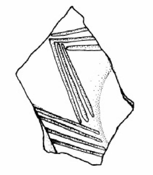 Vasca a calotta decorata alla base con fasci di tre solcature incise a formare un triangolo con vertice verso l'alto a sinistra del quale si trova un fascio di quattro solcature verticali.