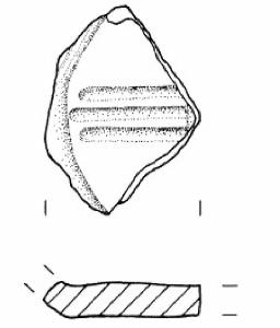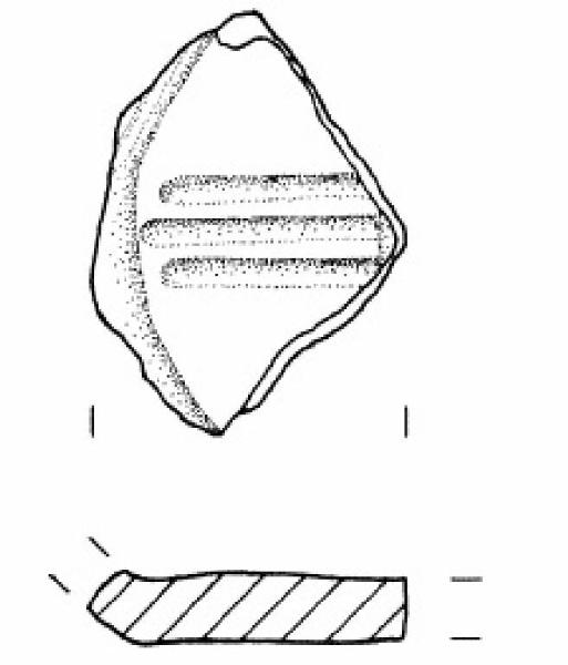 Fondo piatto decorato con un fascio di tre solcature rettilinee che formavano probabilmente un motivo cruciforme. Ci sono tracce di solcature sulla piccola porzione di vasca conservata.