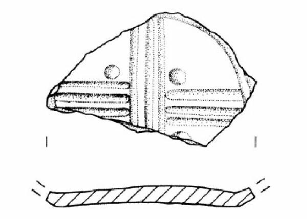 Fondo piatto decorato con un fascio di tre solcature rettilinee centrale con ai lati due fasci di tre solcature disposti ortogonalmente a formare un motivo cruciforme con coppelle negli angoli. Ci sono tracce di un fascio circolare di solcature disposto intorno al fondo sulla piccola porzione di vasca conservata.