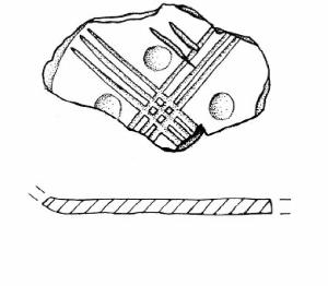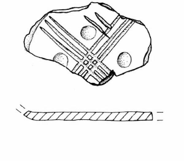Fondo piatto decorato con due fasci di tre solcature rettilinee disposti ortogonalmente a formare un motivo cruciforme con coppelle negli angoli.