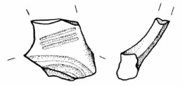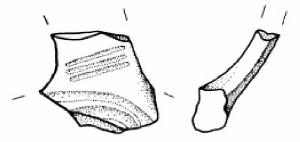 Attacco inferiore d'ansa a nastro decorato con un fascio di solcature disposte a semicerchio e tre sottili solcature oblique sulla parte inferiore del nastro.