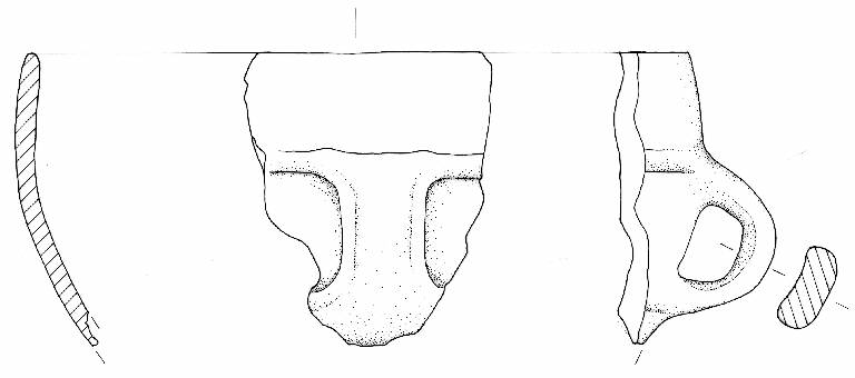 Orlo introflesso arrotondato. Parete a profilo convesso con ansa a nastro insellato e attacco verticale impostata al di sotto dell'orlo, prolungamento delle basi dell'ansa in cordoni orizzontali.