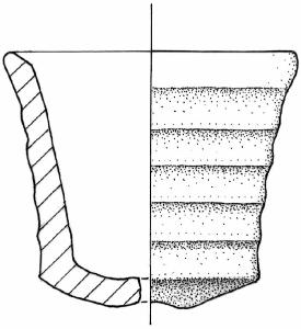 Orlo leggermente esoverso obliquo verso l'interno. Parete a profilo concavo decorata da cinque solcature orizzontali. Fondo convesso ombelicato.