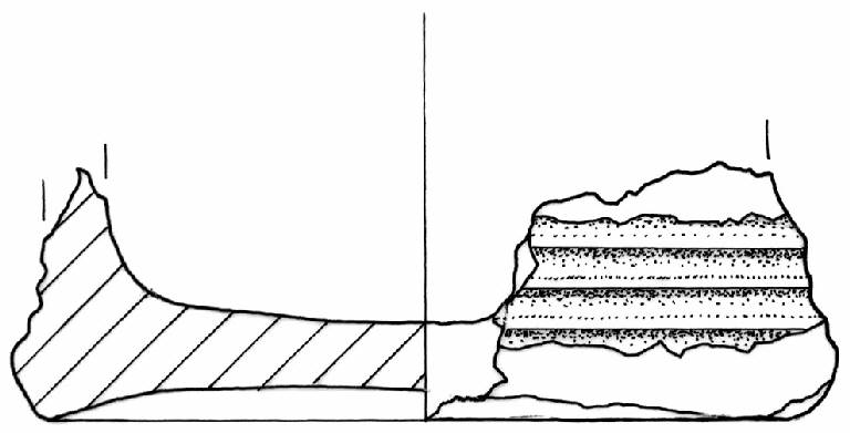 Fondo concavo a tacco con decorazione a quattro sottili solcature parallele nel piccolo frammento restituito.