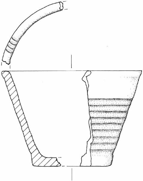 Orlo esoverso e leggermente distinto, decorato da un fascio di quattro brevi solcature parallele, parete a profilo troncoconico rettilineo con decorazione costituita da nove solcature parallele, fondo piatto e distinto.