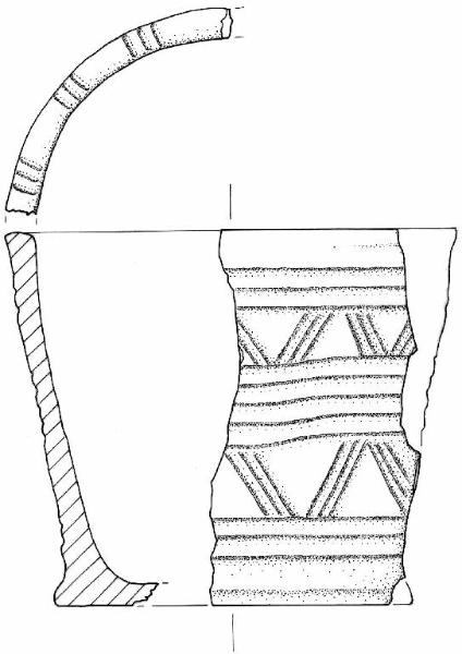 Orlo estroflesso piatto decorato a fasci di tre brevi solcature in disposizione metopale. Parete a profilo rettilineo decorata da tre fasci di solcature parallele alternati a due fasci di solcature oblique formanti un motivo a triangoli ricorrenti. Fondo piatto a tacco.