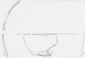 Orlo diritto decorato ad impressioni digitali. Parete a profilo leggermente convesso con grossa presa a lingueta orizzontale e cordone serpeggiante decorato ad impressioni digitali.