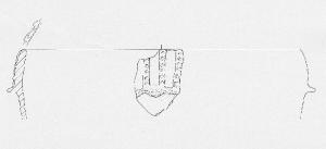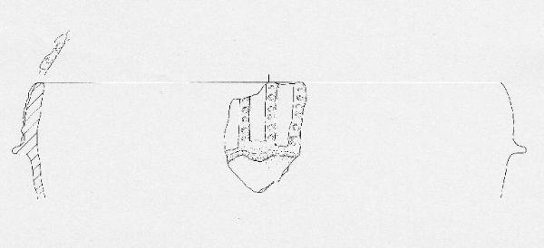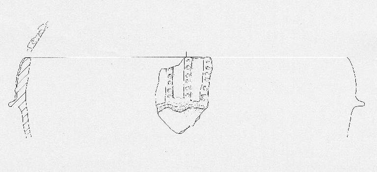 Orlo leggermente introflesso decorato ad impressioni digitali. Parete a profilo convesso con decorazione plastica formata da tre cordoni verticali paralleli digitati, impostati a partire dall'orlo, e da una presa a linguetta con cordone orizzontale, forse ad andamento serpeggiante.