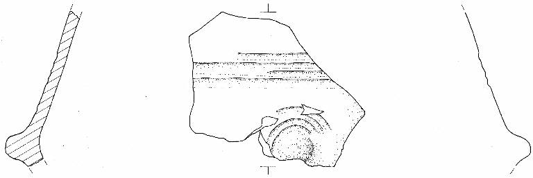 Parete superiore rettilinea, decorata a solcature orizzontali parallele, sul diametro massimo bugna plastica sormontata da quattro solcature concentriche ad arco di cerchio.