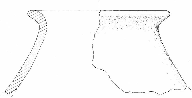 Orlo fortemente estroflesso e obliquo. Parete del tronnco di cono superiore rettilinea. Decorazione assente.