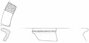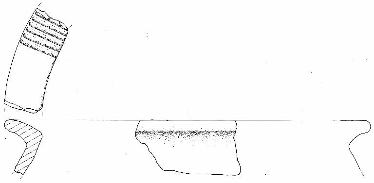 Orlo a larga tesa obliqua verso l'interno decorata a solcature. Parete superiore ad andamento rettilineo.