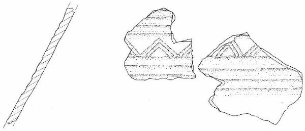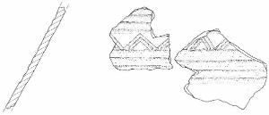 Parete a profilo rettilineo decorata con dua fasci di solcature parallele cui si interpone un motivo, realizzato con sottili solcature, a triangoli ricorrenti.