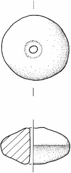 Corpo biconico con carena a metà altezza. Facce superiore e inferiore piane; foro in posizione leggemente asimmetrica.