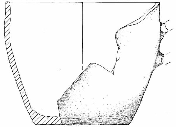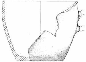 Orlo leggermente appiattito, parete a profilo convesso e base piana. Sono visibili gli attacchi superiore ed inferiore di un'ansa impostata a breve distanza dall'orlo.