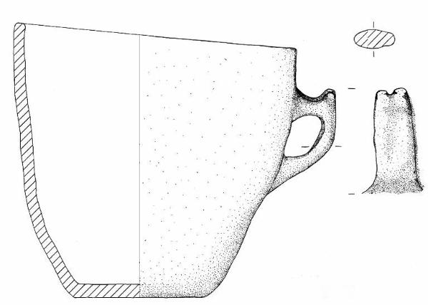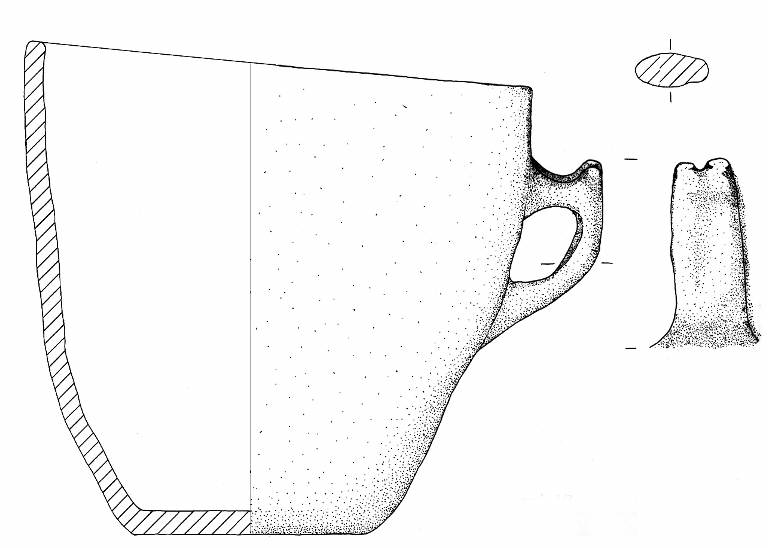Orlo arrotondato, parete a profilo convesso e base piana. A breve distanza dall'orlo è impostata un'ansa nastriforme con profilo a gomito recante sull'apice due piccoli tubercoli di forma cilindrica.