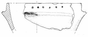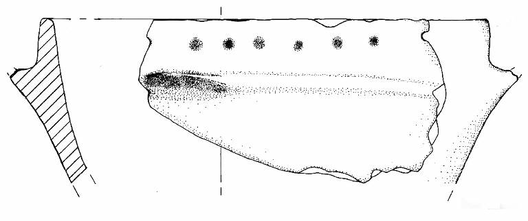 Orlo arrotondato multiforato e parete a profilo convesso. A breve distanza dall'orlo è collocato un cordone orizzontale su cui è posizionata una presa a linguetta di forma semicorcolare e rivolta verso l'alto di cui manca una piccola parte dell'estremità superiore.