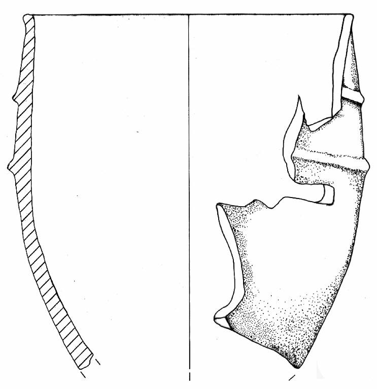 Orlo appiattito, labbro esoverso e parete a profilo convesso. Sulla parete sono impostati due cordoni orizzontali a sezione triangolare.
