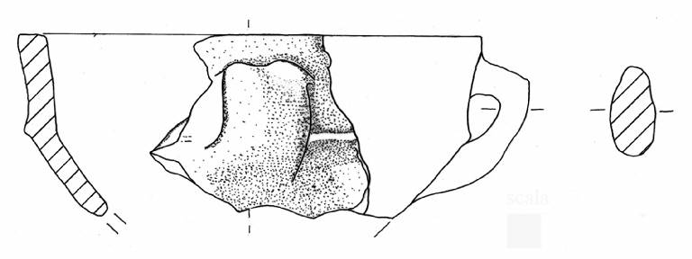 A breve distanza dall'orlo appiattito è impostata un'ansa nastriforme con profilo a gomito e ponticello superiore obliquo.