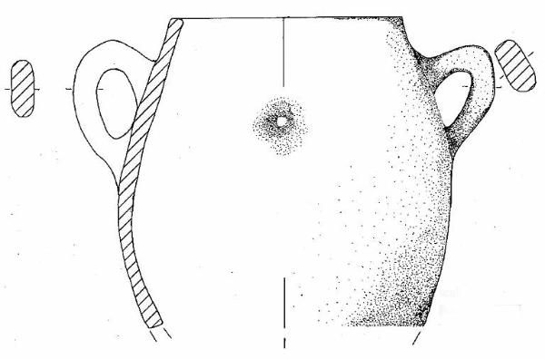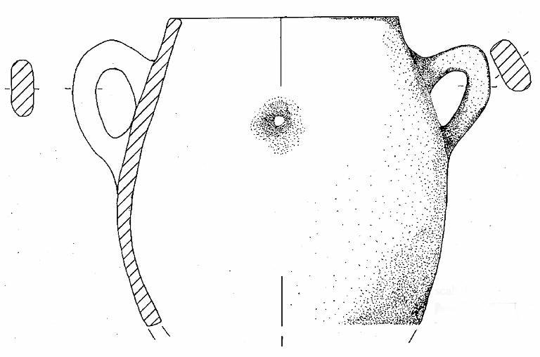 Orlo appiattito e parete a profilo convesso. Le anse, nastriformi, collocate a breve distanza dall'orlo, hanno profilo ad orecchio. A breve distanza dall'orlo, tra le due anse è impostato un piccolo tubercolo di forma circolare.