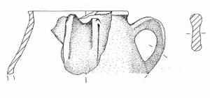 Orlo appiattito e parete a profilo convesso. A breve distanza dall'orlo è impostata un'ansa nastriforme fortemente insellata con profilo ad orecchio.
