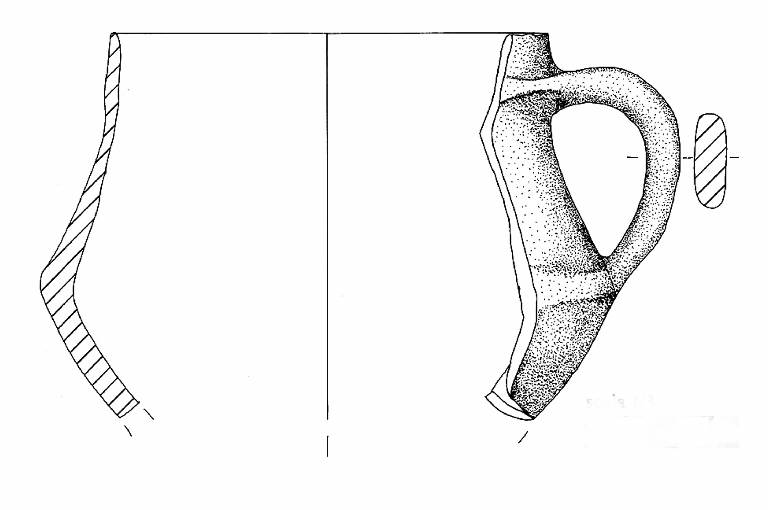 Orlo arrotondato, assottigliato. A breve distanza dall'orlo impostata un'ansa nastriforme con profilo ad orecchio. In corrispondenza degli attacchi inferiore e superiore dell'ansa sono posizionati due cordoni orizzontali poco pronunciati.