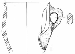 Orlo arrotondato e assottigliato. A breve distanza dall'orlo è impostata un'ansa nastriforme con profilo a gomito.