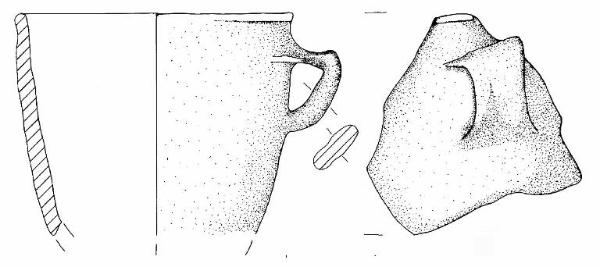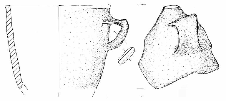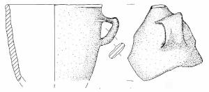 Orlo arrotondato e parete a profilo convesso. A breve distanza dall'orlo è impostata un'ansa nastriforme con profilo a goito e lieve cresta.