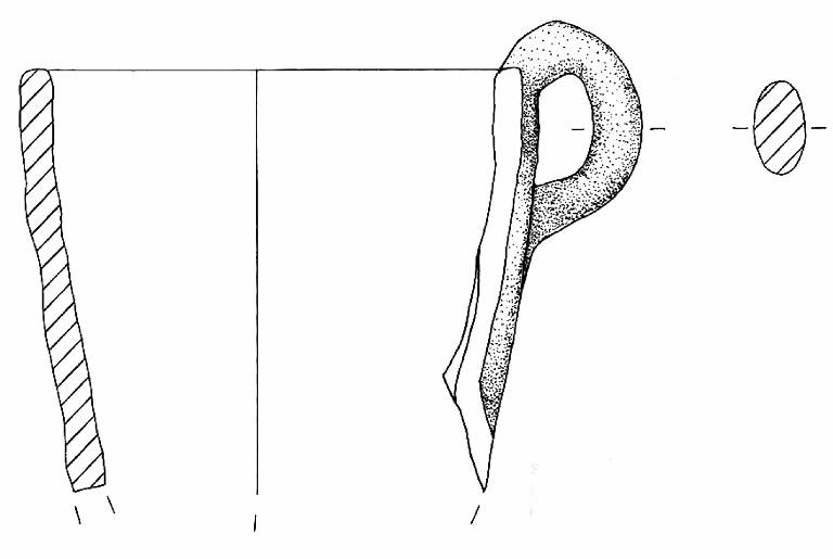 Orlo leggermente appiattito e parete a profilo rettilineo. All'altezza dell'orlo è impostata un'ansa a sezione semicircolare sopraelevata con profilo ad orecchio.