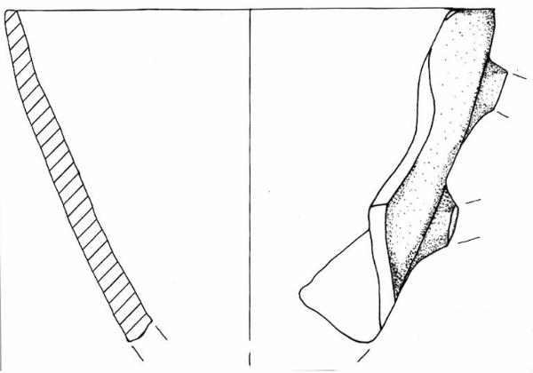 Orlo appiattito e parete a profilo convesso. A breve distanza dall'orlo sono evidenti gli attacchi superiore ed inferiore di un'ansa che non si è conservata.