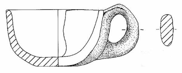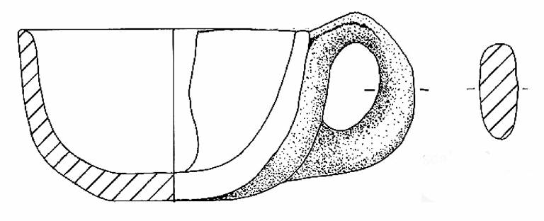 Orlo arrotondato, leggermente assottigliato, parete a profilo convesso e base piana. All'altezza dell'orlo è impostata un'ansa nastriforme sopraelevata con profilo ad orecchio.