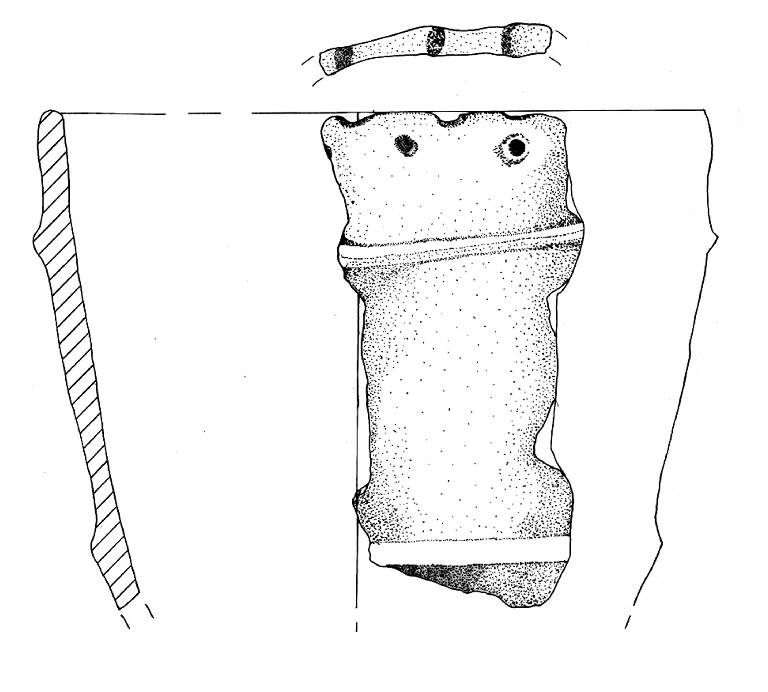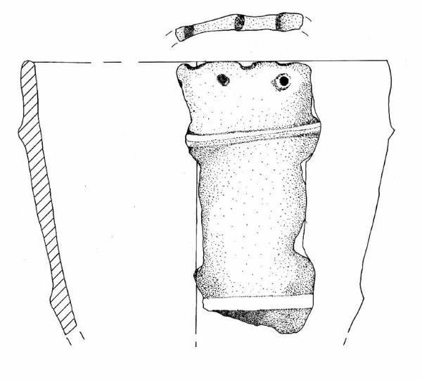 Orlo arrotondato, multiforato, decorato con impressioni di polpastrello e parete a profilo rettilineo. A breve distanza dall'orlo è impostato un primo cordone orizzontale, il secondo si trova oltre la metà del vaso e appare poco pronunciato.