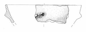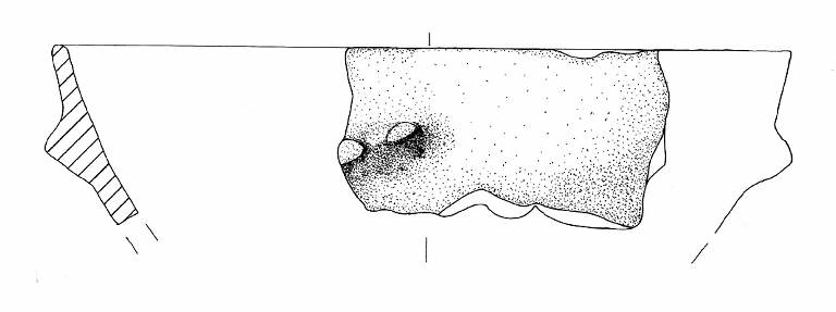 Orlo arrotondato, assottigliato e parete a profilo convesso. A breve distanza dall'orlo è impostata una presa a linguetta a coda di rondine.
