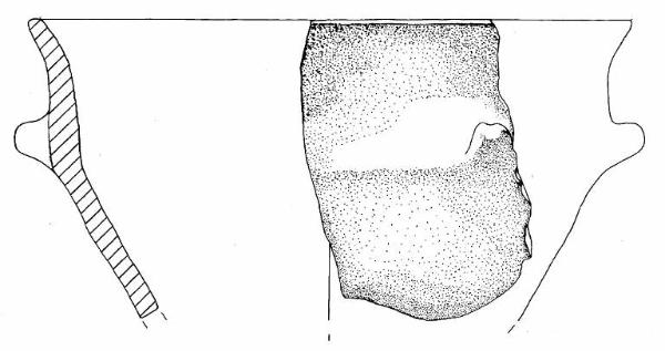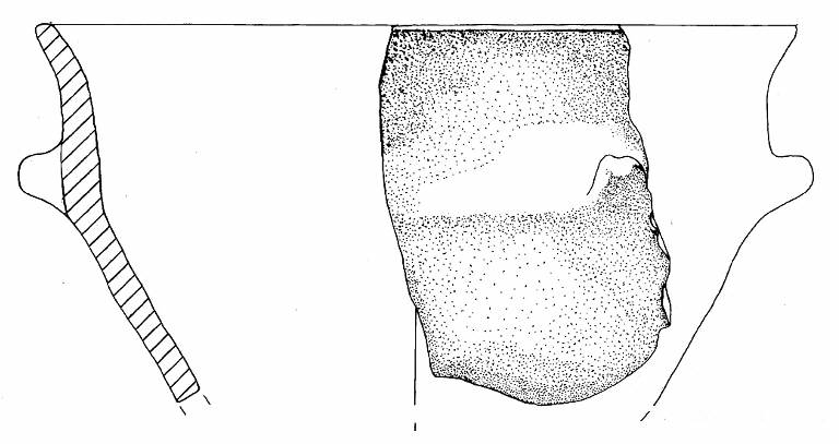 Orlo appiattito e parete a profilo sinuoso. A breve distanza dall'orlo è impostata una presa a linguetta molto pronuncita di forma semicircolare.