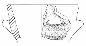 Orlo arrotondato e parete a profilo convesso. A breve distanza dall'orlo è impostata una presa a linguetta di forma rettangolare, rivolta verso l'alto.