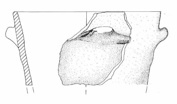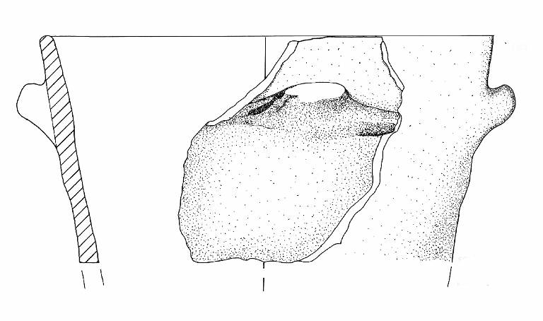 Orlo arrotondato e parete a profilo rettilineo. A breve distanza dall'orlo è impostata una presa a linguetta di forma rettangolare.