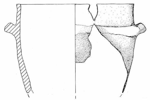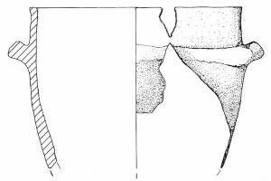 Orlo appiattito e parete a profilo convesso. A breve distanza dall'orlo era impostato un cordone orizzontale di cui rimane solo una lieve traccia. Sopra di esso si trova una decorazione plastica costituita da un bottone cilindrico rivolto verso l'alto, a breve distanza da quest'ultima si nota la traccia di un'altra di tali decorazioni.
