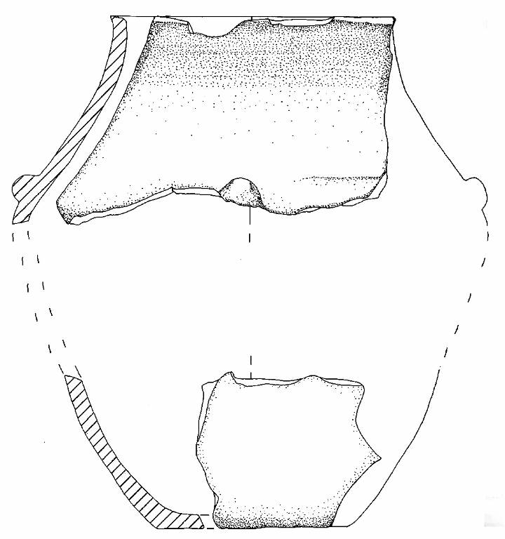 Orlo appiattito, labbro esoverso, parete a profilo sinuoso e base piana. All'altezza del diametro massimo è impostata una bugna di forma semicircolare.