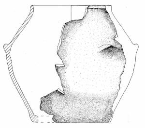 Orlo arrotondato, labbro esoverso e parete a profilo sinuoso. Lungo il diametro massimo è impostata una presa a linguetta di forma circolare e rivolta verso l'alto.