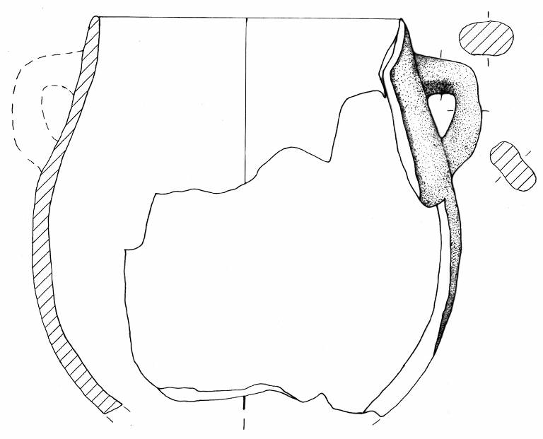 Orlo arrotondato, assottigliato e parete a profilo convesso. A breve distanza dall'orlo è impostata un'ansa nastriforme con profilo a gomito.