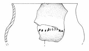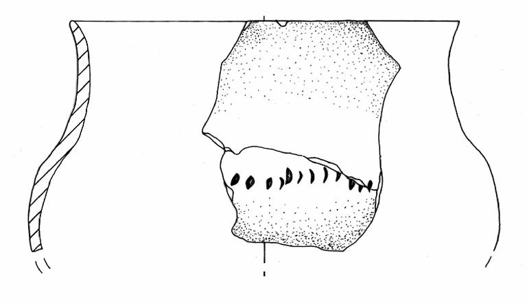 Orlo arrotondato, assottigliato e parete a profilo sinuoso. In corrispondenza del diametro max decorazione a unghiate.